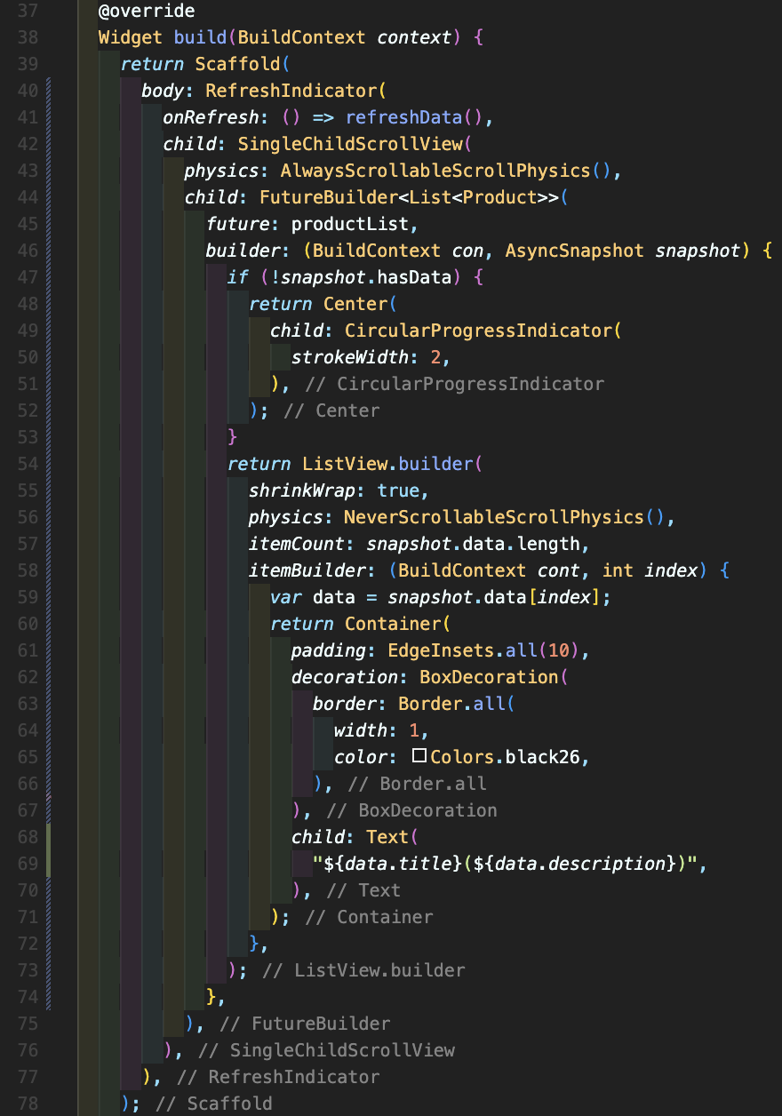 Step 5: 제일 복잡한 부분입니다. 먼저 RefreshIndicator를 적어주고 onRefresh 속성에 refreshData() 함수를 넣습니다. 42번째에 SingleChildScrollView를 넣었는데 RefreshIndicator는 기본적으로 스크롤되지 않으면 작동되지 않기 때문에 SingleChildScrollView를 통해 physics 속성에 AlwaysScrollableScrollPhysics()를 넣어서 항상 스크롤 될 수 있도록 만들어주셔야 합니다. 그 후에 44번째 줄처럼 FutureBuilder을 넣고 타입이 <List<Product>>으로 넣어주셔야 합니다. 45번째 future 속성으로 10번째 줄에서 생성한 변수인 productList를 넣어줍니다. 그 후 builder 속성을 만드시고 아래처럼 쭉 작성해주시면 되는데 snapshot에 data가 있는지 없는지 여부가 판단되기 때문에 if (!snapshot.hasData)를 사용해서 데이터가 아직 존재하지 않을 때에는 로딩 중 표시 위젯인 CircularProgressIndicator로 표시해줄 수 있습니다. else인 경우 ListView.builder를 사용해서 배열의 모든 요소들을 컨테이너로 표현했습니다.
