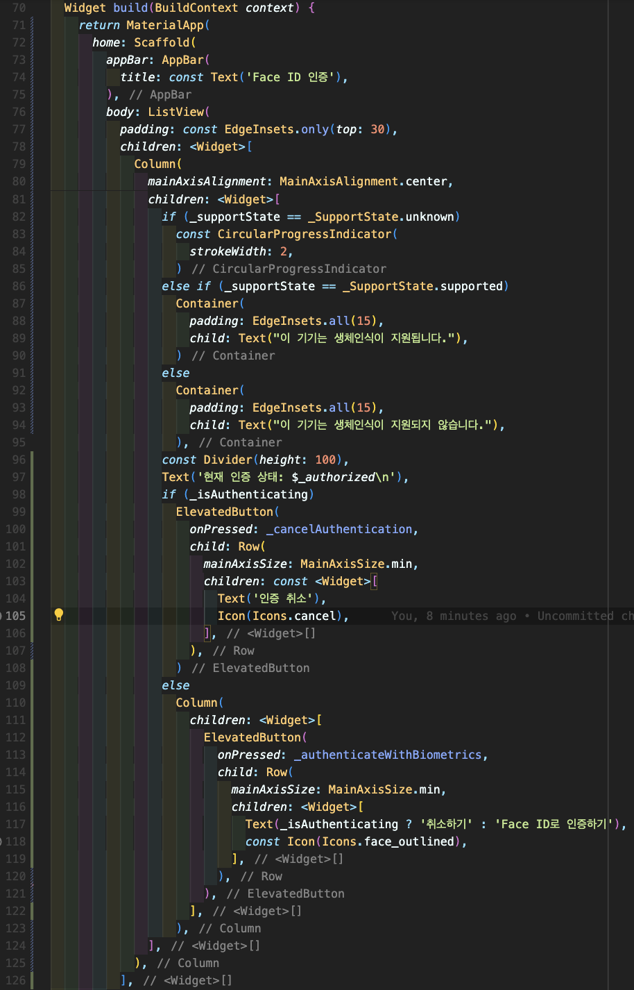 Step 7: build 위젯입니다. 113번째 줄에 _authenticateWithBiometrics 함수를 호출하게 되며 Face ID가 가능한 아이폰 및 아이패드로 실행시 Face ID 인증 화면이 나오게 됩니다. 그리고 97번째 줄에 있는 $_authorized 변수와 setState 상태 업데이트를 통해 완료를 표시해주면 됩니다.