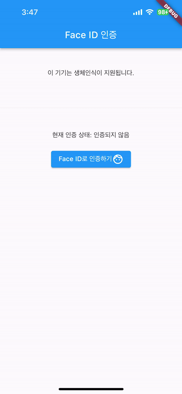 Step 9: 시뮬레이터에서는 Face ID 인증하려고 하는 화면은 보이지만 실제로 구동이 되지는 않아서 제가 가지고 있는 아이폰으로 테스트해본 모습입니다.