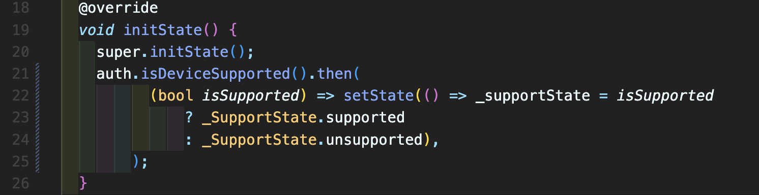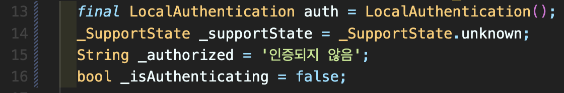 Step 4: initState 내부에 auth.isDeviceSupported().then 함수를 아래처럼 적어줍니다.
