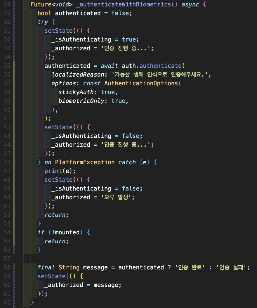 Step 5: _authenticateWithBiometrics() async 함수를 명시해주시면 되며 아래 전체 코드를 첨부했고 위의 패키지 예제 페이지로 가서 복사하셔도 됩니다.