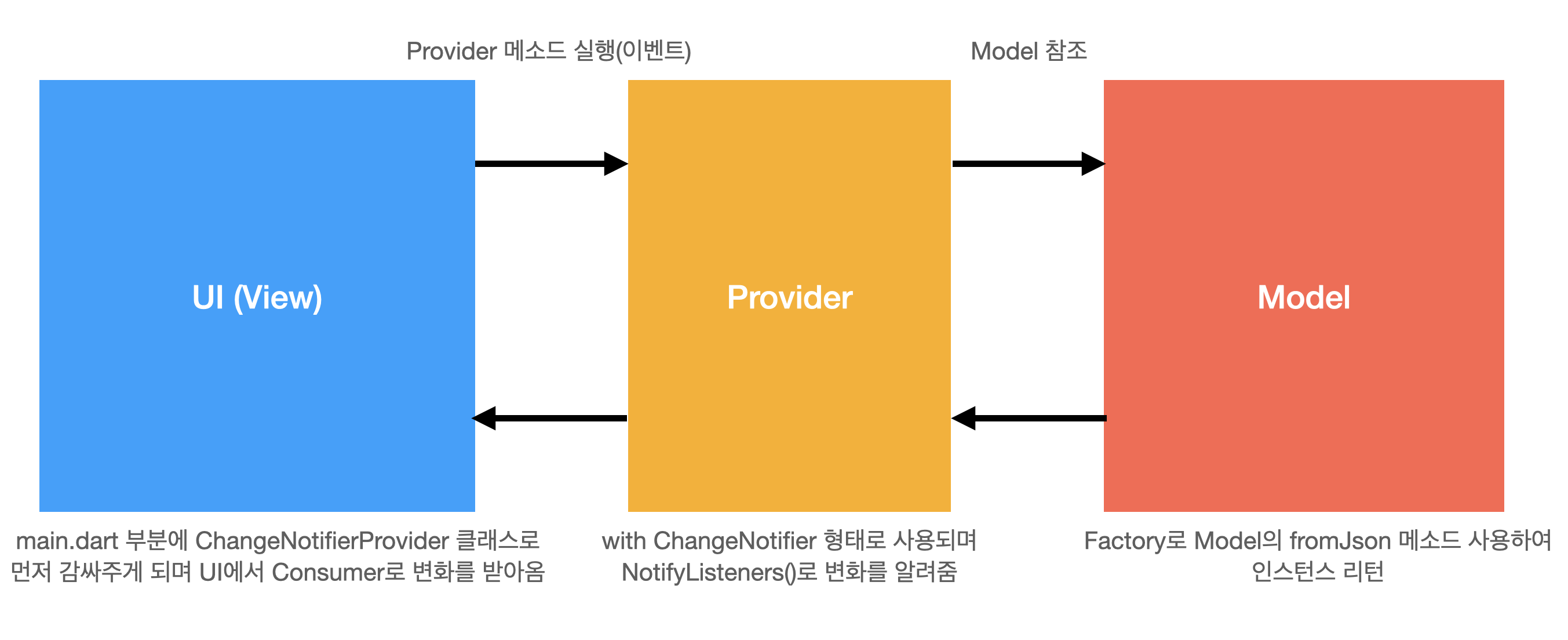 제가 이 포스팅에서 소개할 Provider의 개념 내용은 아래와 같습니다. 먼저 UI (View) 부분이 있고 UI에서 Provider의 메소드를 실행하여 데이터를 수정하거나 데이터를 가져오게 됩니다. 그 Provider는 Model에 명시되어 있는 데이터 변수들을 fromJson 메소드를 이용하여 인스턴스로 리턴하여 Provider에 있는 데이터 변수에 저장하게 됩니다. 저장한 후에 NotifyListeners() 메소드를 사용해 변화되었다는 것을 알려주면 UI (View)에서는 Consumer로 변화를 받아와서 화면에 적용할 수 있도록 할 수 있습니다. 다만 이 Consumer는 Provider.of를 사용하는 것과 동일하며 차이라고 한다면 Provider.of(context) 경우에는 사용하는 위젯 전체가 rebuild(다시 빌드)되고, Consumer를 사용하면 일부 부분만 rebuild 될 수 있도록 만들어줄 수 있습니다. 물론 Provider.of(context) 경우에도 listen: false로 파라미터를 설정해놓으면 rebuild 되는 것을 방지할 수 있습니다. 이 예제에서는 Consumer로 적용해서 보여드리도록 하겠습니다. 그리고 main.dart에는 ChangeNotifierProvider 클래스로 감싸주게 됩니다. 자세한 것은 아래 스크린샷을 통해서 보여드리도록 하겠습니다.