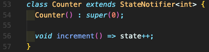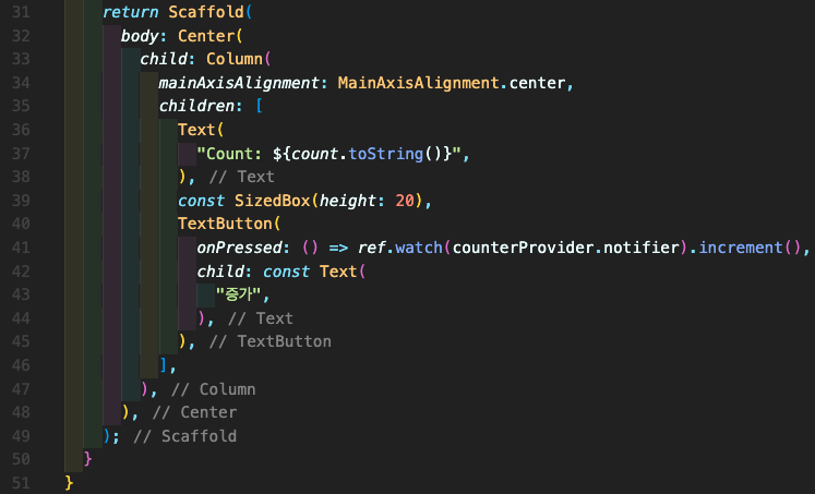 Step 5: Scaffold 위젯을 만들어주었고 37번째에 count 변수를 보여주는 텍스트 위젯, 41번째에 버튼을 눌렀을 때, ref.watch(counterProvider.notifier).increment() 함수를 통해 count 값을 증가시킬 수 있습니다.
