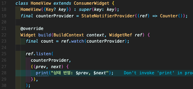 Step 4: 중요한 HomeView 클래스이며 ConsumerWidget를 extends하게 됩니다. 19번째 StateNotifierProvider를 활용해서 변수를 선언해줍니다. 22번째 줄에 WidgetRef ref를 통해 상태를 watch, read, listen할 수 있으며 23번째에서는 count 값을 ref.watch(counterProvider)를 통해 가져옵니다. 25-30번째 줄은 log를 보기 위해 작성한 것으로 정말로 상태가 업데이트된 경우에 listen를 통해 검증하고 원하는 로직을 실행할 수 있습니다. 주의할 것은 counterProvider 다음 (prev, next)로 명시한 부분이 있는데 2개의 파라미터가 들어가며 쉽게 말해 반영되기 이전 값, 반영된 값이라고 보시면 됩니다.