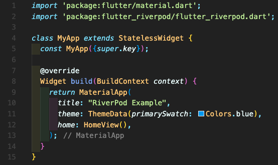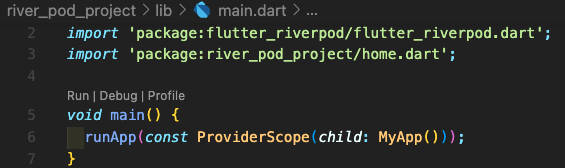 Step 2: main.dart 안에 runApp 함수 쪽에 ProviderScope로 MyApp를 감싸줍니다. 2번째 줄 flutter_riverpod 해주셔야 합니다.