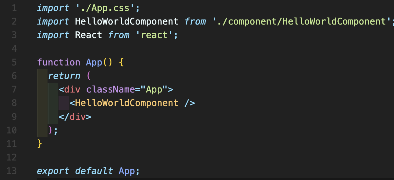 Step 3: App.js 파일에서 HelloWorldComponent 컴포넌트를 합쳐주겠습니다. 2번째에 import HelloWorldComponent from './component/HelloWorldComponent'를 작성해주시고 8번째 줄에 <HelloWorldComponent />로 작성해서 불러올 수 있습니다. 13번째 줄에도 export default App;를 작성해서 내보내주면 됩니다.