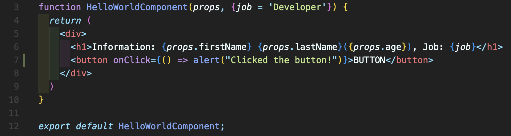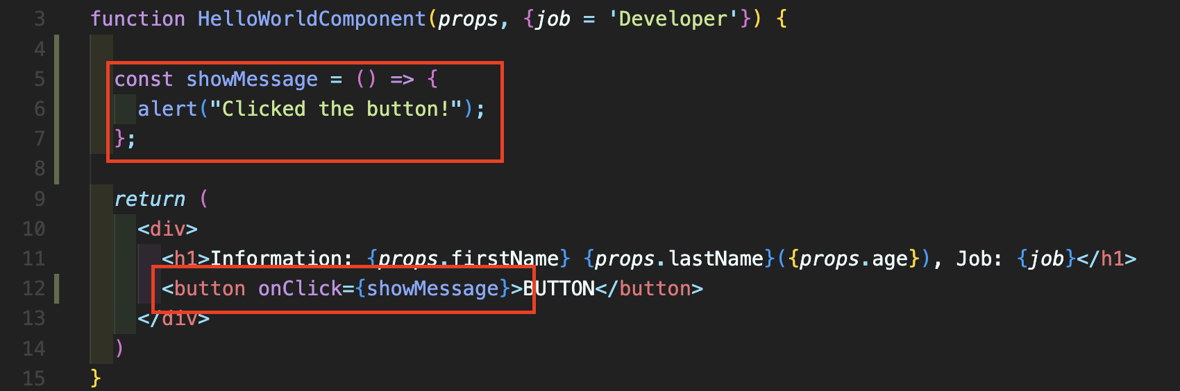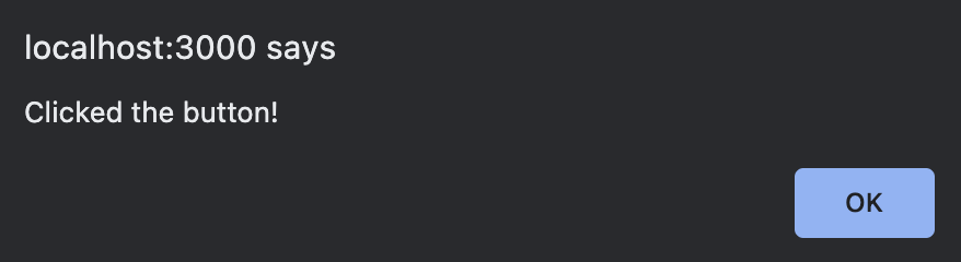 Step 1: HelloWorldComponent.js 파일에서 7번째 줄처럼 button를 추가하고 onClick={} 형태로 적어줍니다. 여기에 바로 자바스크립트 코드를 넣어주셔도 되고 사전에 함수를 선언하여 여기에 적어주면 됩니다. 먼저 () => alert 방식으로 바로 넣어주었습니다.