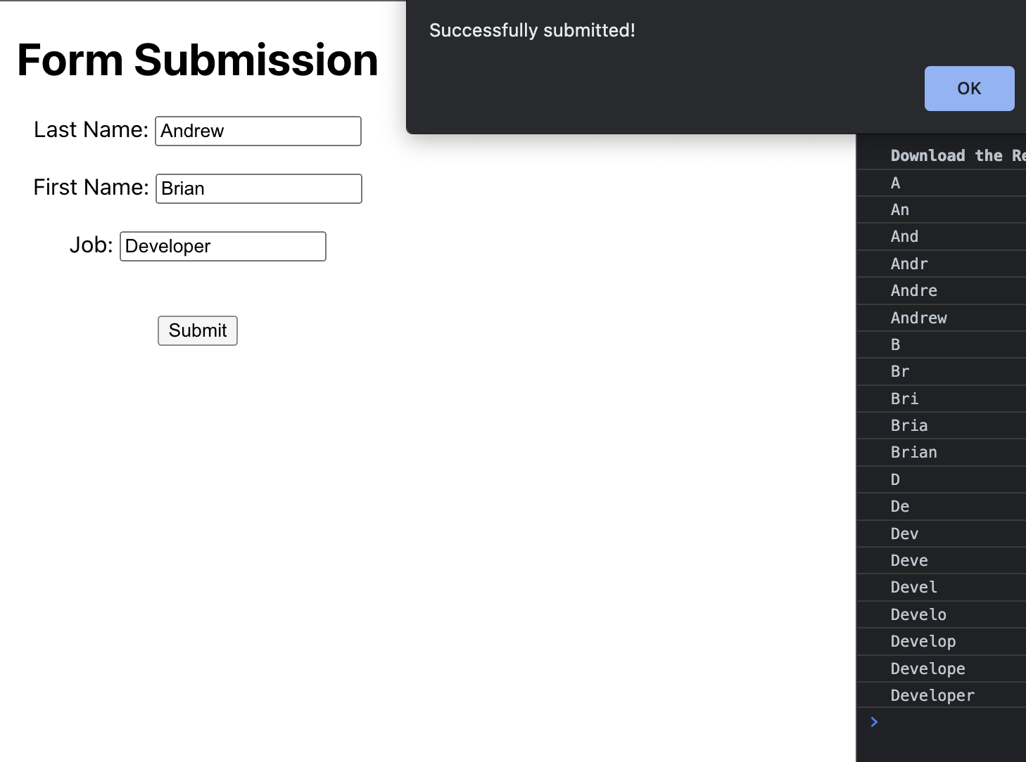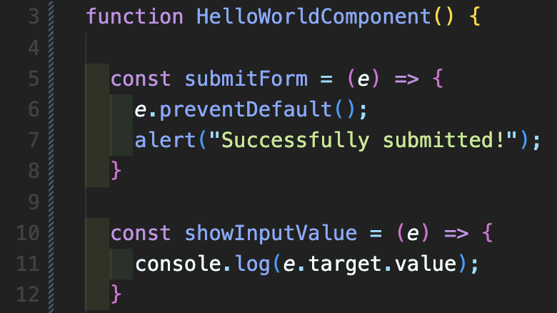 그 다음 아래 5~12번째 줄처럼 Form를 제출했을 때 필요한 함수와 각 input을 입력했을 때 콘솔에서 값을 확인할 수 있도록 해주는 함수를 각각 선언하여 만들어줍니다. 6번째 preventDefault 함수는 기본적으로 정의된 이벤트를 실행하지 못하도록 방지해주는 함수이며 form을 제출하게 되면 href나 창이 새로고침되기 때문에 이것을 일단 방지해주기 위해 사용합니다. 그 후 alert 메시지로 제출되었는지를 확인해보면 됩니다. 10~12번째 줄에 보면 e.target.value를 사용한 것을 볼 수 있는데 만약 Last Name 오른쪽에 입력칸에 마우스를 클릭하면 이 때 e.target는 <input name="lastName">이 되고 e.target.value를 사용하면 이 입력값을 가져올 수 있습니다.