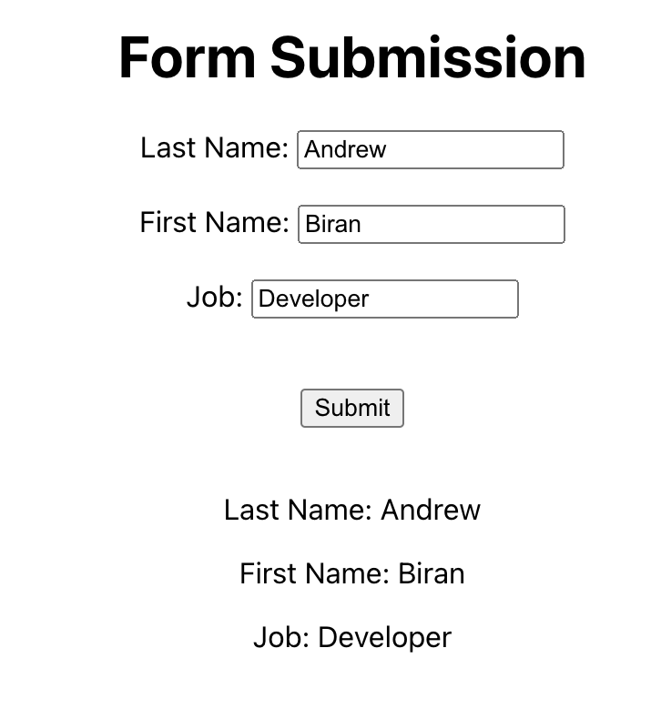 Step 5: 결과는 아래와 같습니다. 위와 같이 useState를 사용하지 않으면 submit 버튼을 눌러도 아래에 <div> 태그가 출력되지 않기 때문에 상태 업데이트를 통해서 코드를 작성해주셔야 합니다.