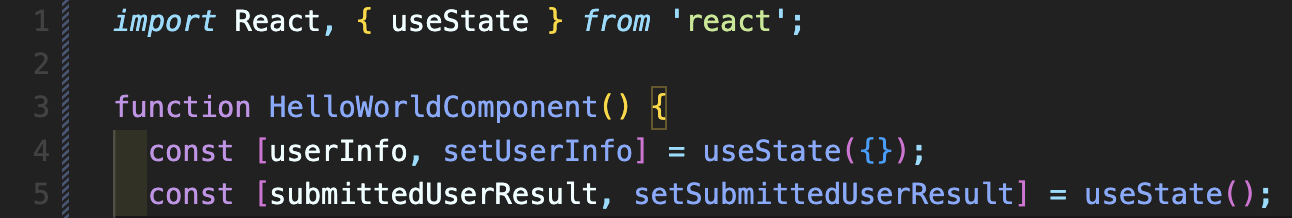 useState는 const [변수, 변수의 상태를 변경하는 함수] = useState(기본 변수값) 이렇게 구성이 됩니다. const [userInfo, setUserInfo]는 바로 Deconstructing assignment라고 하며 useState 자체가 2개의 변수를 가지기 때문에 각각 userInfo와 setUserInfo에 할당해주게 됩니다. 즉 const [a, b] = [10, 20];과 동일한 원리입니다. 리액트에서는 그냥 변수에 재할당한다고 해서 상태가 업데이트되어 UI가 재랜더링되지 않기 때문에 이 useState를 이용해서 변수를 업데이트해주어야 합니다.