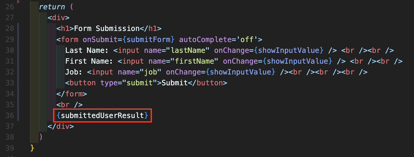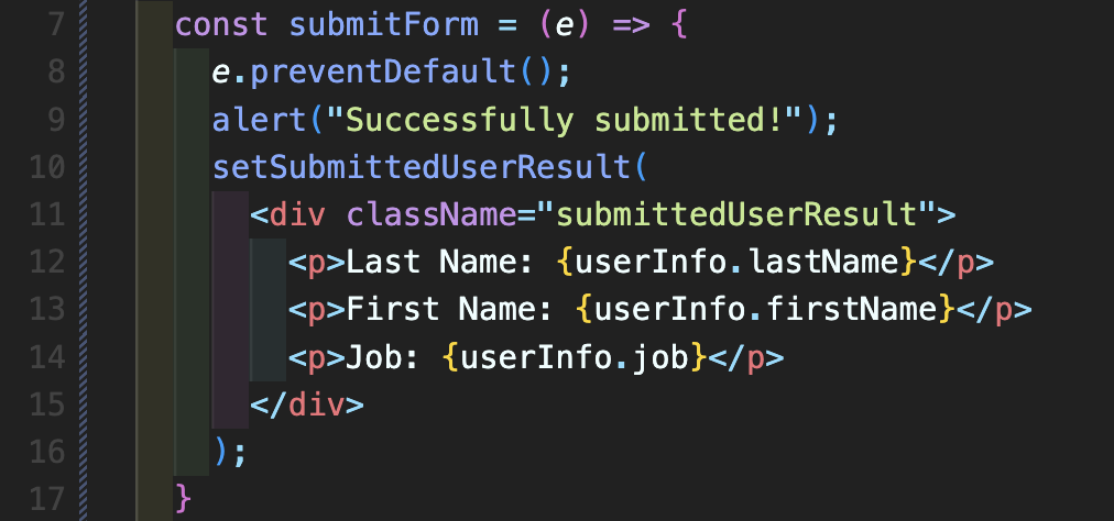 Step 4: 36번째 줄에 {submittedUserResult}을 적어주면 완성입니다. 처음에 submittedUserResult에는 값이 없지만 추후 폼 제출하면 submitedUserResult에는 <div> 즉 결과값들을 출력할 수 있도록 변수가 업데이트되어 UI에 반영되게 됩니다.