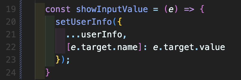 21번째 줄에 ...userInfo은 userInfo의 모든 누적된 값을 적용시켜주기 위함이며 [e.target.name] 이 부분에는 e.target.name에 각각 lastName, firstName, job이 들어가게 되고 e.target.value에 각각 입력한 값들이 들어가게 됩니다.