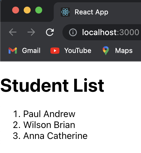 Step 2: StudentComponent.js 파일을 만들고 아래처럼 코드를 작성해줍니다. 제일 중요한 부분은 <ol> 태그 사이에 있는 {students.map 부분이며 이 map을 사용하여 배열의 각 요소를 모두 출력할 수 있도록 해줍니다. 위의 Student.js에 props를 사용했기 때문에 여기에서 lastName, firstName의 parameter를 명시해주셔야 합니다. 이 map을 활용하는 것은 매우 중요하기 때문에 반드시 이해하셔야 합니다.