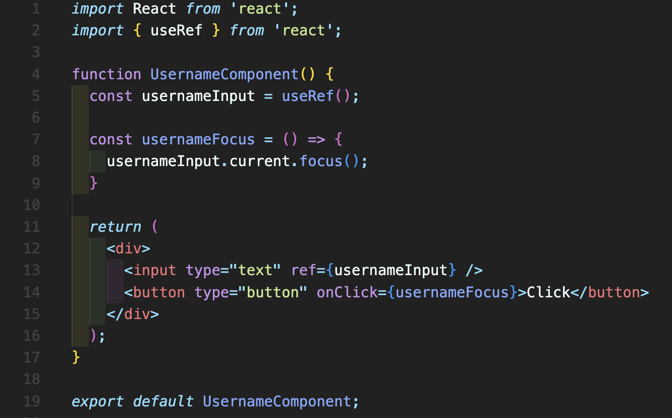 Step 1: UsernameComponent.js 파일을 하나 생성하고 다음처럼 코딩해줍니다. 2번째 줄에 useRef를 import 해주고 5번째 줄처럼 const usernameInput = useRef();로 선언한 뒤에 13번째 줄 <input ref={usernameInput} />으로 연결시켜 줍니다. 그리고 버튼을 눌렀을 때 usernameFocus 함수를 사용하여 usernameInput.current.focus();로 초점을 줄 수 있도록 합니다.